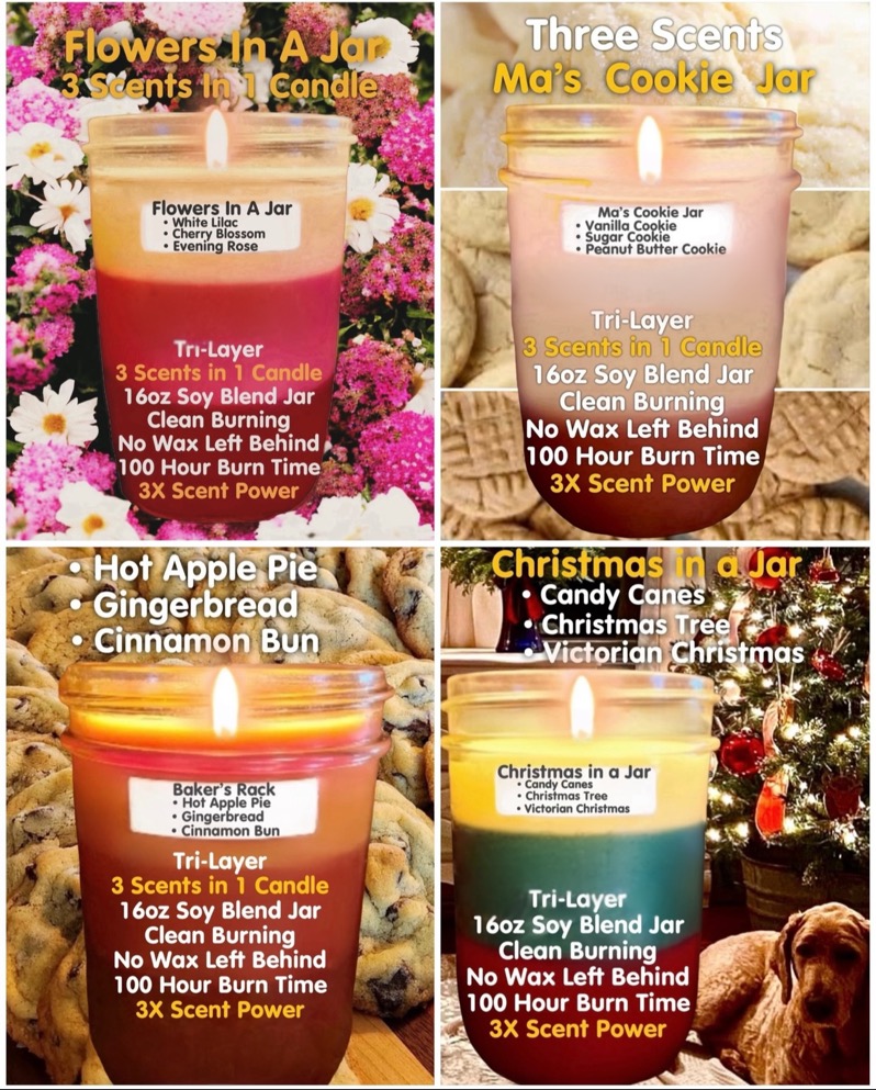 This is a unique Soy Candle with 3 Separate MAXIMUM SCENTED Layers. The Three in One Candle is one of our Best Sellers.
